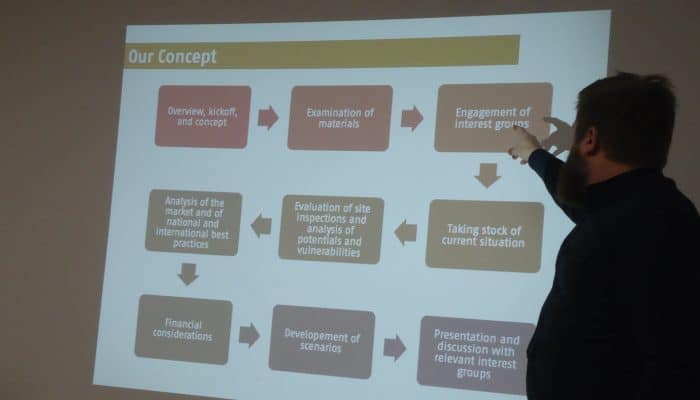 Meeting at the GIZ Offices in Berlin on the 6th of December 2019. Jonnas Wigger (standing) making a presentation on the Association of Municipal Companies of Germany.